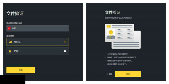 5、在这里,您可以看到相应的验证类型:证件签发国家/地区、拍摄政府颁发身份证正反两面的照片。不同国家或地区的限额各不相同。点击【证件签发国家/地区】的按钮,可以选择您的居住国或地区。