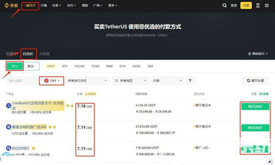 6、在进行现货交易前需要获得USDT,可在“一键买币”——“自选区”——“买入”获得,注意法币需要选择CNY,然后根据需求选择交易商家