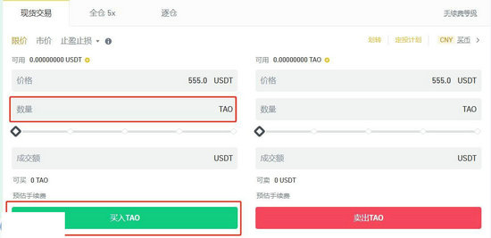 9、填写买入数量,点击【买入TAO】即可完成TAO币交易