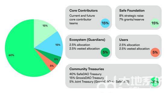 Safe DAO与Gnosis DAO金库:分配总供应量的60%,前者分配40%线性解锁八年,后者分配15%线性解锁四年,联合金库分配5%无锁仓,金库内的资产需要经过治理投票使用。