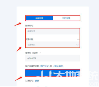 1、打开交易所,在首页点击注册进入页面,选择邮箱注册或者是手机号码注册,填写信息之后即可注册成功。