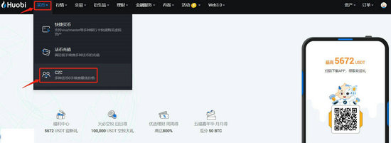 5、换成USDT后,在首页点击【买币】——【C2C】进入C2C交易页面。
