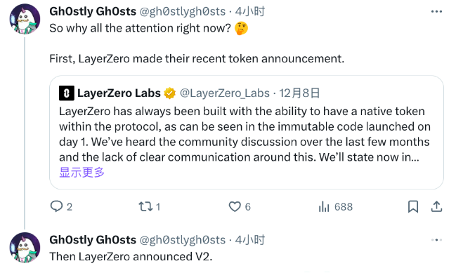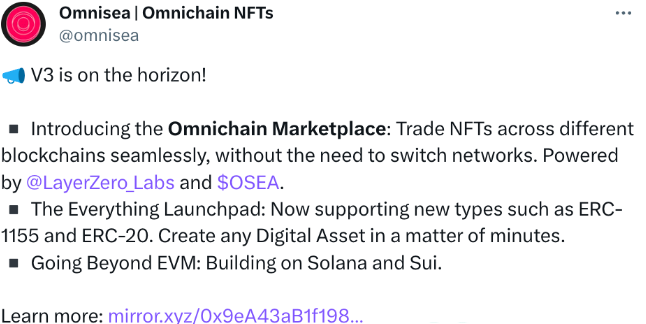 但在最近一两天的时间内,其地板价上涨 70% 左右,目前来到 0.2 E 左右,同时交易量和销售量都迎来了大幅增加。一方面这可能是由于 Ominicat 的 meme 代币引领了全链叙事的热潮,另一方面我们也可以从其官推中看到,Layerzero 在最近提到了自己的代币设计,同时V2版本也即将发布。
