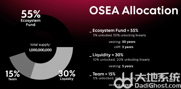 - 30% 为流动性(用于组池子、上所和给 OSEA 持有者奖励),初始解锁 10% ,剩下 20% 5 年内线性解锁。