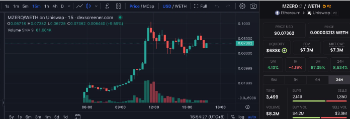 此外,项目的代币 MZERO 也于 12 月 22 日在 Uniswap 上线。截止发稿时,MZERO 的市值仅为 730 万美金左右, 24 小时涨幅也达到了惊人的 85 倍。