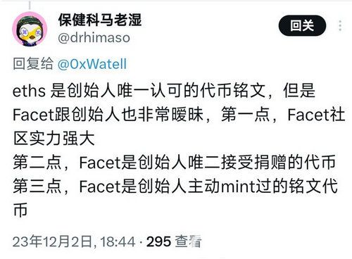 简介:FACET 是另外一个热度颇高的铭文项目,社区宣传中也经常将其与 ETHS 捆绑营销,比如下图中解释了二者之间的微妙关系。从市值与社区热度来看,FACET 可以算是以太坊铭文板块的龙二,但其市值与龙一 ETHS 仍有较大差距。