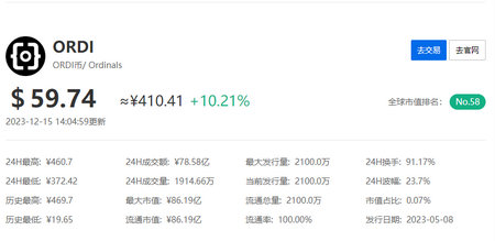 总之,Ordi币的实力还算不错,本身也有一定价值,加上比特币的加持,Ordi币的热度后期会更高,但是价格变化还是很大的,同时Ordi 代币是基于比特币网络和 Ordinals 协议的一种实验性代币,作为 BRC-20 代币标准的首个应用实例,具有独特的价值和发展潜力。
