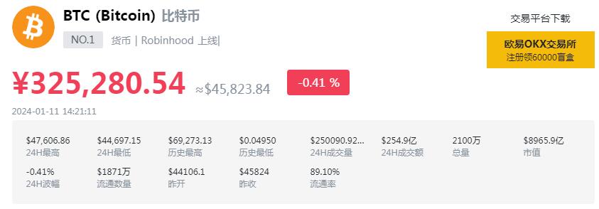 比特币最新价格是多少?截止2024.1.11为止,1比特币≈$45,823.84比特币(BitCoin)的概念最初由中本聪在2008年提出,根据中本聪的思路设计发布的开源软件以及建构其上的P2P网络。比特币是一种P2P形式的数字货币。点对点的传输意味着一个去中心化的支付系统。下面小编为大家分享比特币最新价格行情走势。