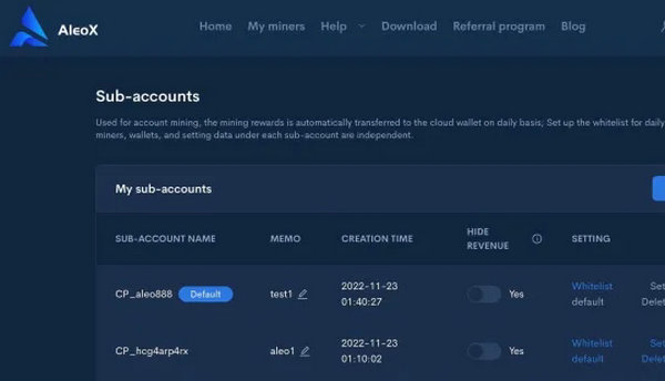 在AleoX矿池挖掘之前,用户需要生成一个子帐户。Aleox将以您的名义自动分配一个子帐户。在“我的矿工”页面中查看您的子帐户名称。