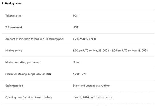届时,用户将可通过质押Toncoin(TON)来获得NOT代币奖励,质押池中总计1,283,990,271枚NOT,每人最多可质押4,000枚TON,奖励将每分钟计算,质押TON越多、时间越早,获得的奖励价值越高。