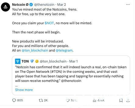 Notcoin近期从一款玩法逻辑简单直接的Telegram 游戏,到获得加密主流交易所和资金的青睐,将于5月16日同时在18家交易所上市交易,包括Binance、Okx、Bybit、Kucoin、Bitget、Gate io、Bitmart、Bitfinex、Cryptocom等。