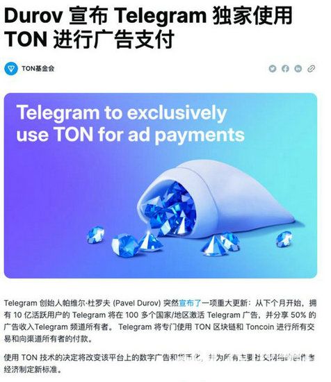 近期,除了Telegram 创始人 Durove 向表示正在考虑进行IPO的打算之外;Durove在个人频道里明牌宣告TON代币的官方出售渠道;Telegram 广告平台将正式向近百个新国家的所有广告主开放,为了确保广告支付和提款的快速和安全,将专门使用 TON 区块链,内容创作者将能够兑现他们的 Toncoin,或者将其重新投资以推广和升级他们的频道。这些举动将加速TON网络的发展,真正拓宽区块链的用例和场景。
