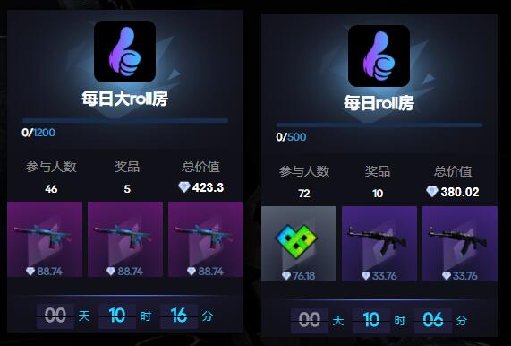 除了开箱,还为用户准备了丰厚奖品的Roll房,各种Roll房也是琳琅满目,从完全免费参加的到开箱活动参与的房间,每天都有Roll出皮肤,包括价值上千的匕首,并且给喜欢白票的用户还准备了每日免费获得账户余额这样'撸羊毛'的机会。