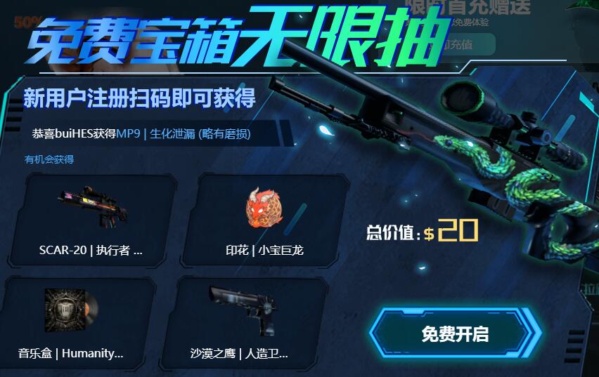 最新开箱网站,可直接取回csgo饰品,新站高爆率优惠活动 登陆后即可领取0.8刀,如果登陆后没领取到美元,登陆后点击右上角加号,在下方代码处输入邀请码,点击右边的√即可领取0.8刀,有每日福利。