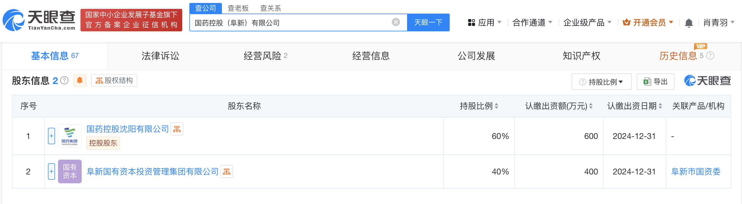 天眼查App显示,近日,国药控股(阜新)有限公司成立,法定代表人为李靖雷,注册资本1000万人民币,经营范围含药品批发、第三类医疗器械经营、保健食品(预包装)销售、第一类医疗器械销售、第二类医疗器械销售等。股东信息显示,该公司由国药控股(HK.01099)旗下国药控股沈阳有限公司、阜新国有资本投资管理集团有限公司共同持股。