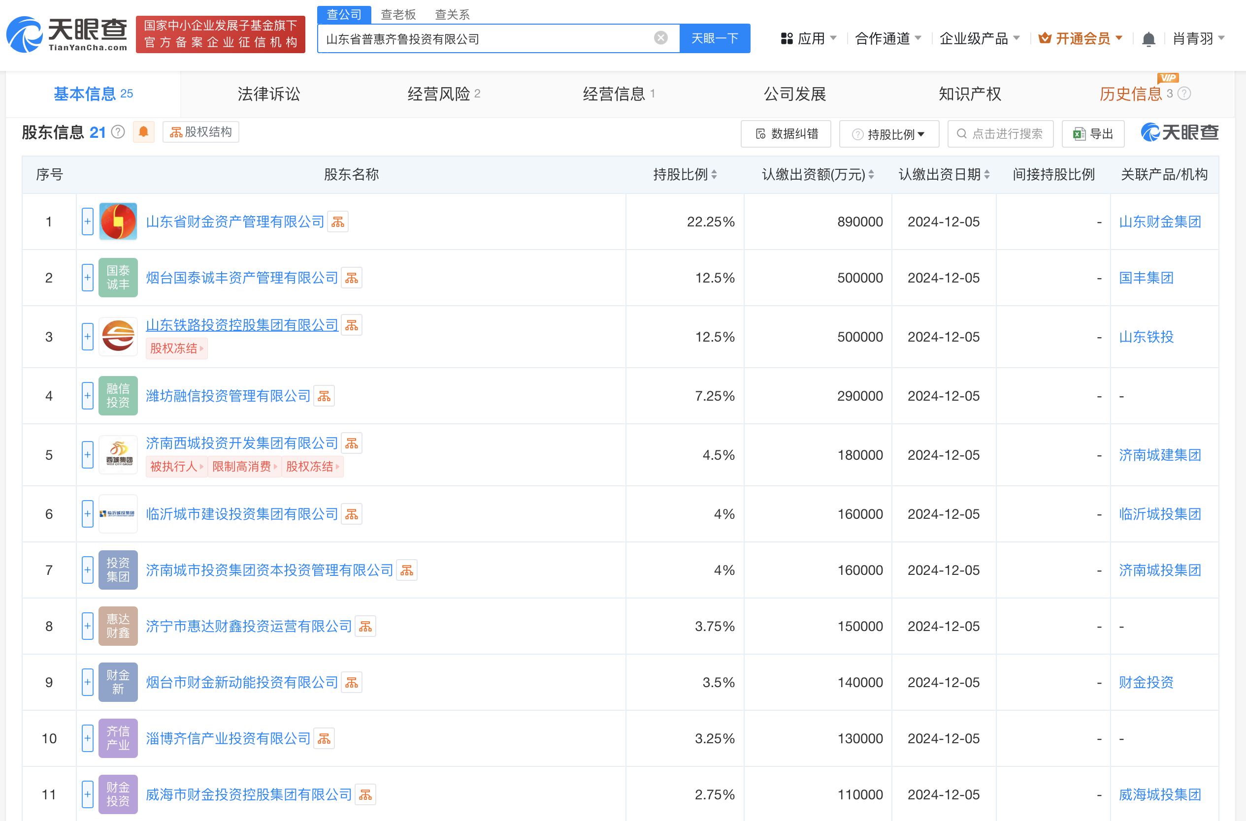 天眼查App显示,近日,山东省普惠齐鲁投资有限公司成立,法定代表人为王安然,注册资本400亿人民币,经营范围含以自有资金从事投资活动、自有资金投资的资产管理服务等。股东信息显示,该公司由山东省财金资产管理有限公司、烟台国泰诚丰资产管理有限公司、山东铁路投资控股集团有限公司、潍坊融信投资管理有限公司等共同持股。