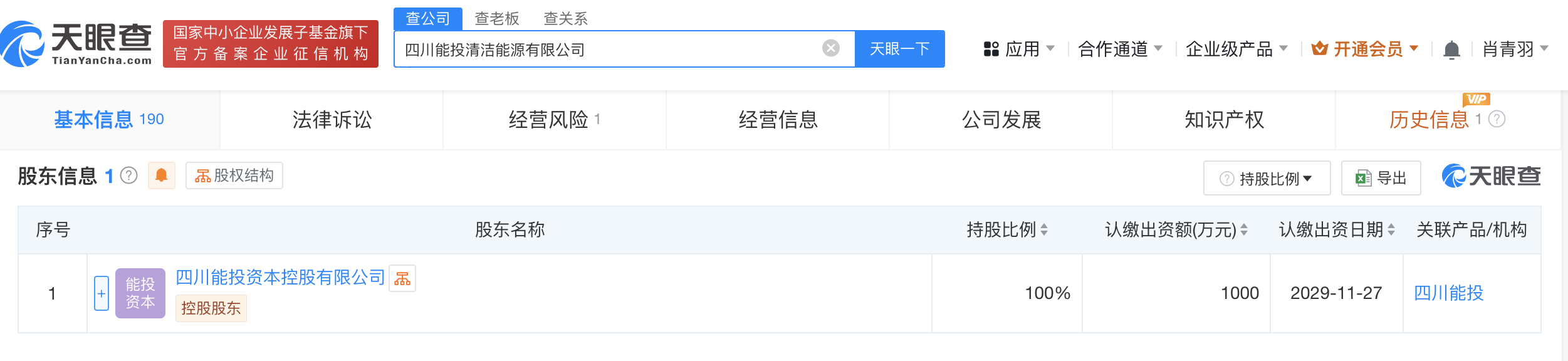 天眼查App显示,近日,四川能投清洁能源有限公司成立,法定代表人为王少国,注册资本1000万人民币,经营范围含节能管理服务、企业管理咨询、信息咨询服务等。股东信息显示,该公司由四川能投资本控股有限公司全资持股。