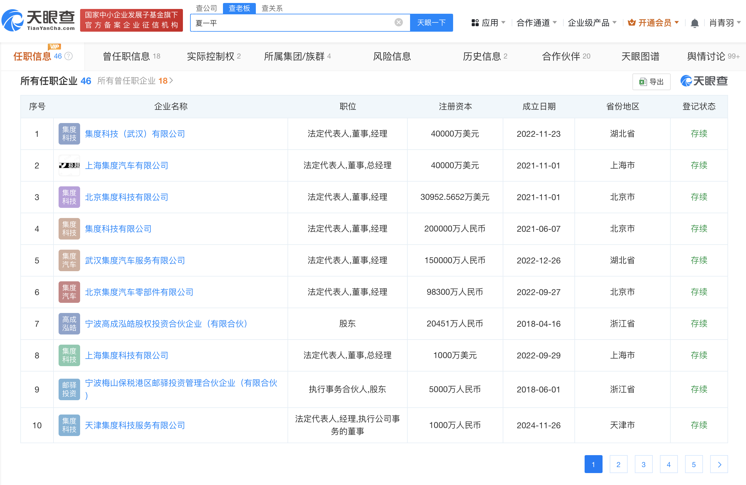 天眼查商业履历信息显示,夏一平共关联46家企业,其中42家为存续或开业状态,包括杭州极与越汽车科技有限公司、上海集度汽车有限公司、集度科技(武汉)有限公司、北京集度科技有限公司等,多为集度在各地的科技服务公司,夏一平在上述企业中担任执行董事、总经理、董事等职务。