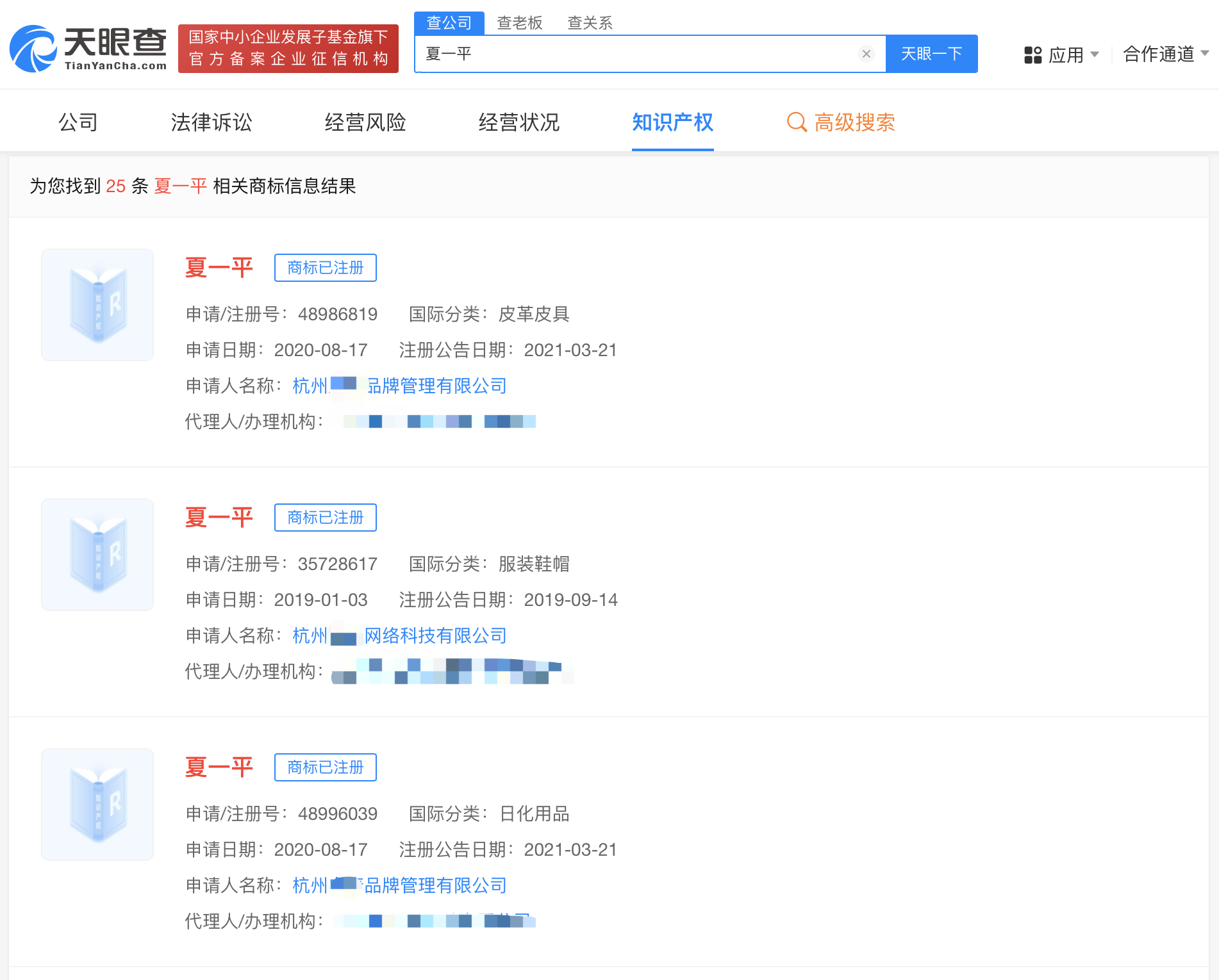 值得注意的是,“夏一平”已被杭州某品牌管理公司、杭州某网络科技公司注册为商标,国际分类为服装鞋帽、皮革皮具、日化用品。