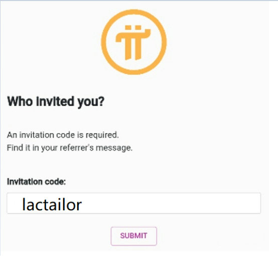 由于Pi Network目前是邀请注册制,所以必须填写邀请码,邀请人和被邀请人双方都会得到奖励,我建议的邀请码是lactailor(使用本邀请可以获得新注册可随机获得1到10个pi币还可以获得加快挖币的流量扶持)填入后单击“SUBMIT”按钮,由于App功能不够完善,有时可能会报错,提示邀请人或邀请码不存在,再次单击“SUBMIT”按钮重试即可,