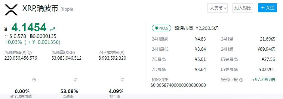 瑞波币最近行情走势是什么?瑞波币是由OpenCoin公司发行的虚拟货币,称作Ripple Credits,又称作XRP,中文名为瑞波币。XRP市值已飙升至360亿美元,与370亿美元市值币安币(BNB)仅一步之遥。这主要是在XRP价格大涨至0.7美元后实现,截稿时为0.69。下面小编为大家分享瑞波币行情最新。