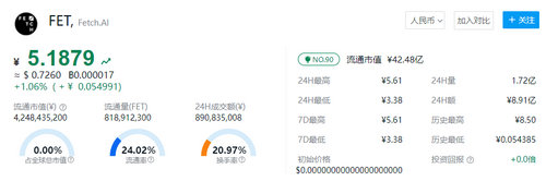 FET币今日价格行情,FET币今日价格是在5.1879人民币,美元是在0.72489,FET币是当前非常热门的AI龙头币,用户可以下载FET币交易所查询最新的价格、行情走势、新闻资讯等等,很多用户还不知道FET币今日价格的价格是多少,接下来小编就带来详细的FET币今日价格行情介绍。