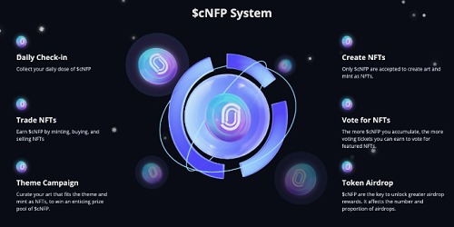 cNFP 累积途径暂时包括:每日签到、好友推荐、NFT 铸造、NFT 交易、社群关注、平台任务、奖池抽奖等等。
