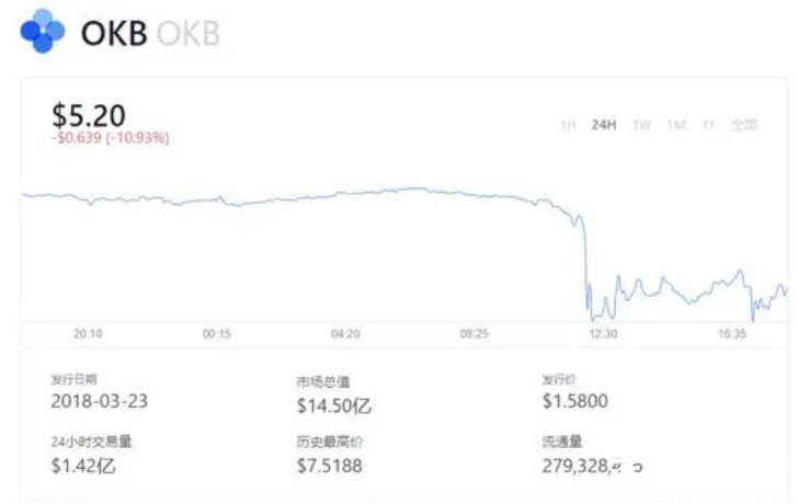 受此影响,一些用户开始直接OTC(场外)变现,导致OKB虚拟币盘中大跌逾16%,截至记者发稿,OKB报价5.2美元,跌幅10.93%,总市值14.5亿美元。