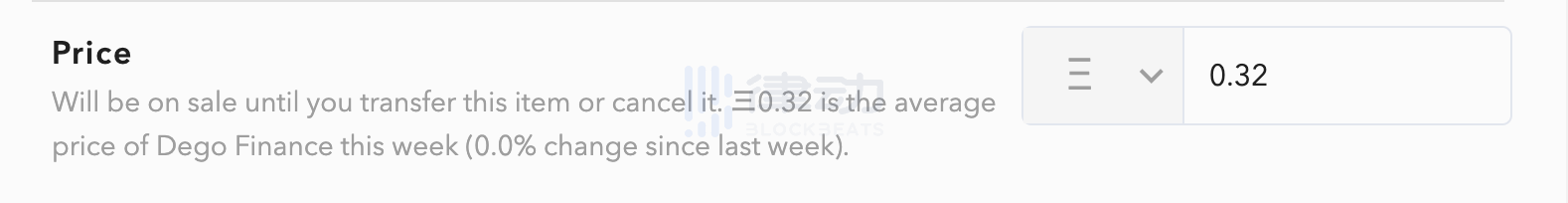 这里我们选定价出售。那么你需要设定出售的价格,不过官方会根据市场均价推荐价格。(律动注:以 Dego 的 NFT 为例,OpenSea 给出的均价建议是所有「镐子」的均价,而不同级别的「镐子」价格相差很大,因此一般来说建议均价并不具有很强的参考性。)