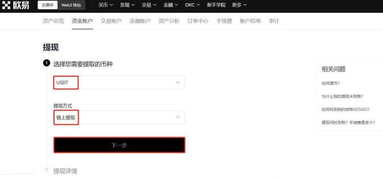 4.在提现页面选择币种【USDT】,提现方式选择【链上提现】点击下一步