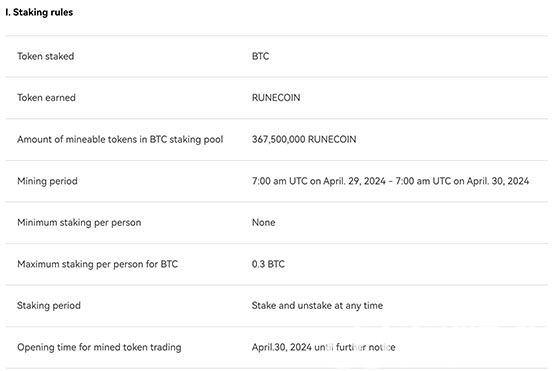 此次挖矿活动允许用户质押最多0.3颗BTC,以赚取新币Runecoin,总共发放3.675亿颗。