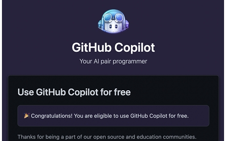 通过之后就可以前往copilot首页,授权登录github之后,就会显示你已经有资格免费使用copilot了: