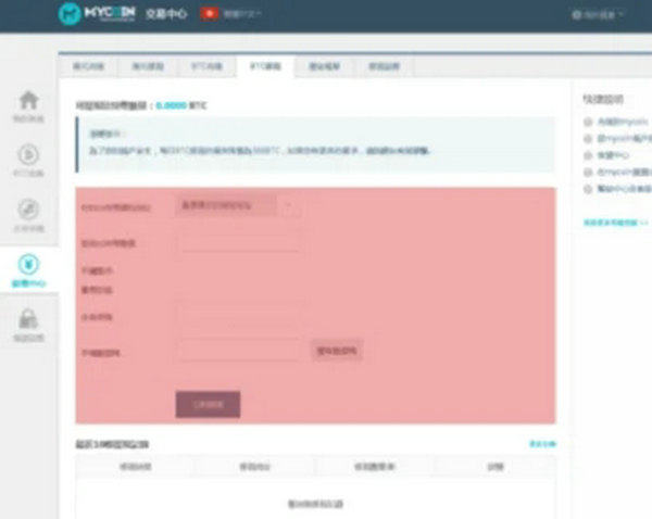 2. 设置完成后,点击上侧的导航栏内人民币提现或者比特币提现。从MYCOIN提现人民币选择收款帐户,输入提现金额,交易密码以及短信验证码方可提现。