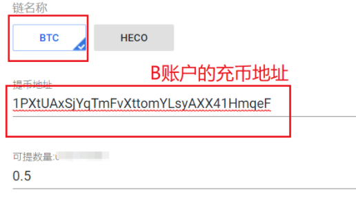 1)选择BTC相同的链名称,粘贴B的BTC地址、输入数量后点击【提币】按钮,输入相应验证信息后并确认提币。