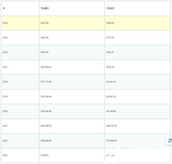 从以上比特币走势分析可以看到,比特币的波动性尤其大。以下简单总结了过去十年比特币的最低价格和最高价格。