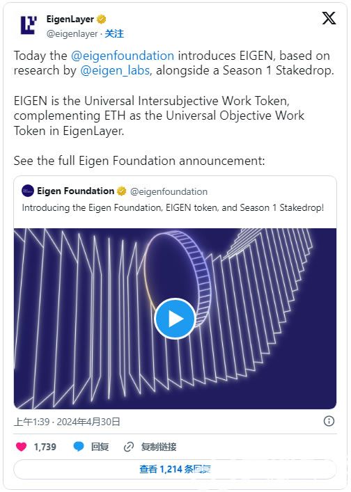 根据EigenLayer 于4 月30 日发出的公告,Eigen 基金会将于5 月推出EIGEN 代币。此外,针对EigenLayer 上的质押者社群的空投也将上线。