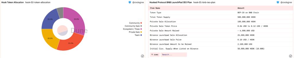 HOOK 总量为500,000,000 枚,其中总供应量的20% 分配给团队和顾问,30% 留用于生态系统,25% 分配给社区,5% ( 25,000,000 枚)通过Binance Launchpad 发售,20% 用于私募。 $HOOK 私募价格为$0.06 ~ $0.12,币安Launchpad 申购价为$0.1。