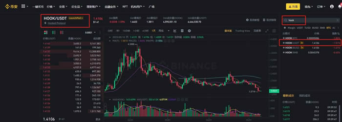 5、在左侧搜索框中搜索HOOK,选择HOOK/USDT,就可以看到HOOK的实时行情: