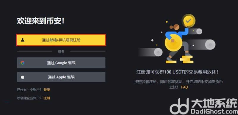 1、打开币安官网(点击立即下载),点击左侧的【使用邮箱/手机号注册】