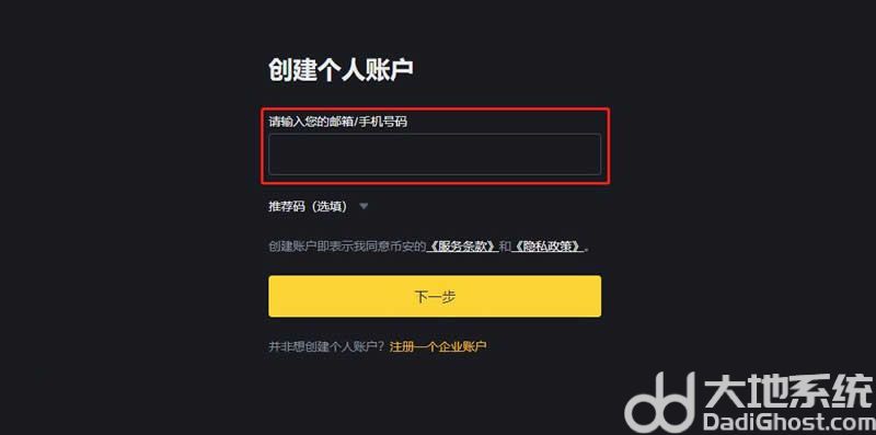 2、币安已全面开放大陆用户进行手机号注册,输入邮箱/手机号、点击下一步即可