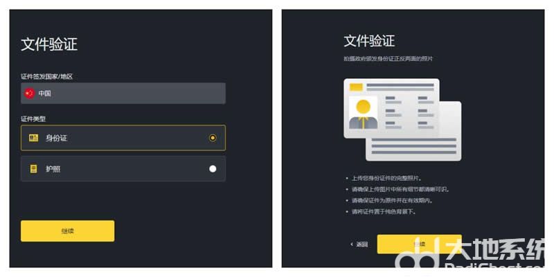 5、在这里,您可以看到相应的验证类型:证件签发国家/地区、拍摄政府颁发身份证正反两面的照片。不同国家或地区的限额各不相同。点击【证件签发国家/地区】的按钮,可以选择您的居住国或地区。