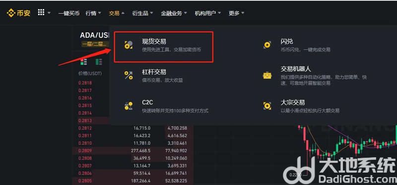 6、点击上方导航栏的【交易】——【现货交易】