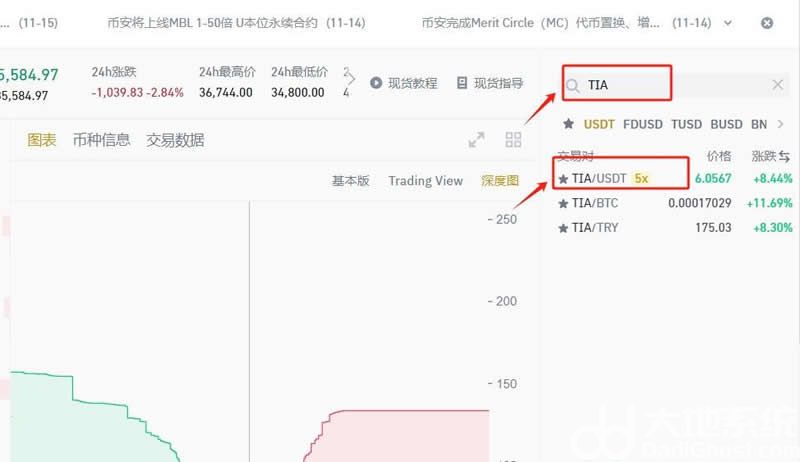 7、搜索币种简称【TIA】,选择【TIA/USDT】交易对