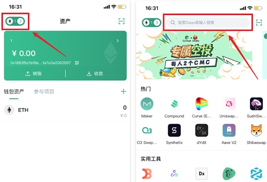 1.打开Coinhub钱包(点击立即下载)切换到ETH链后,点击【发现】在顶部搜索“AAVE”并点击进入