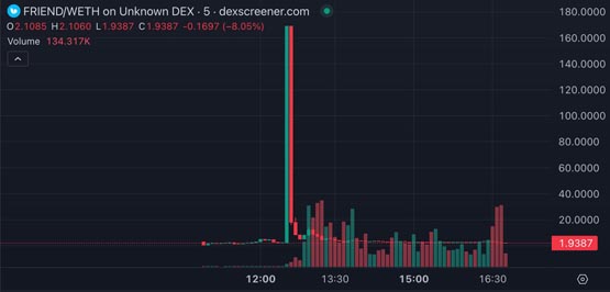 根据Dexscreener数据显示,Friend.tech空投代币$FRIEND于今日10点45分上线后,价格一度暴涨至169.09美元,但随后马上暴跌,涨幅全数回吐,截稿前暂报1.93美元,24小时跌幅高达97%。