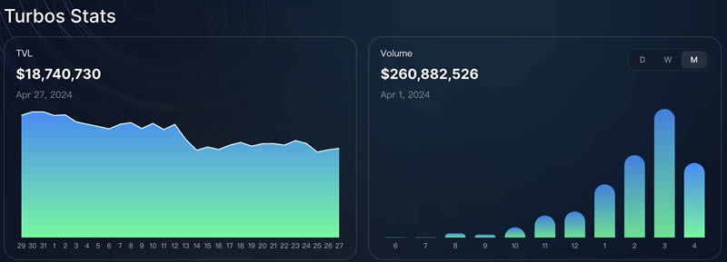 而在众多区块链中,只有 Sui 能满足如此高性能的需求,Turbos 的总交易量已经突破 10 亿美元,3 月 20 日单日交易量达到 3000 万美元,并在最近的交易量中一直保持着强劲的增长势头。