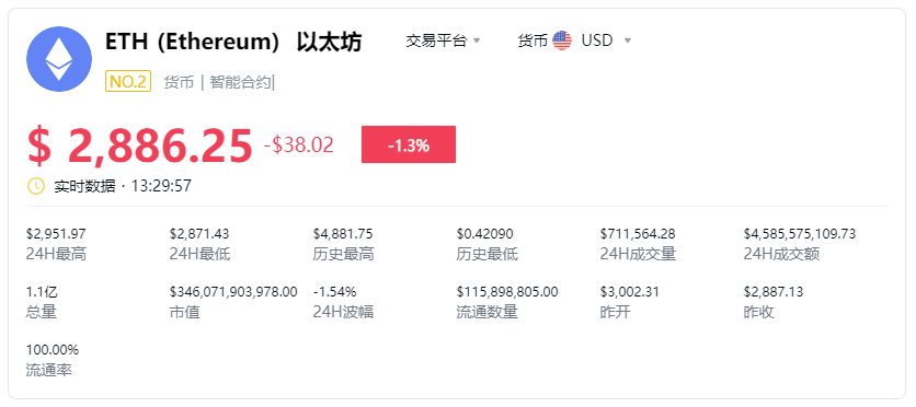 eth价格今日行情怎么样?是一个开源的有智能合约功能的公共区块链平台。eth价格24H最高$2,951.97,24H最低$2,871.43,历史最高$4,881.75,历史最低$0.42090,24H波幅-1.54%,那么下面小编为大家分享美元货币eth价格今日价格。