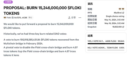 另外,热门Meme币项目Floki在周二(14)也针对燃烧152.4亿枚FLOKI代币的提案进行社群投票,并在今(16)日以99.84%赞成率通过提案。