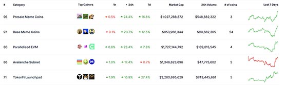 根据Coingecko数据,Presale Meme、Base Meme类别代币在近24小时涨幅排行中,分别占据第一、第二位,分别上涨24.4%、23.7%。