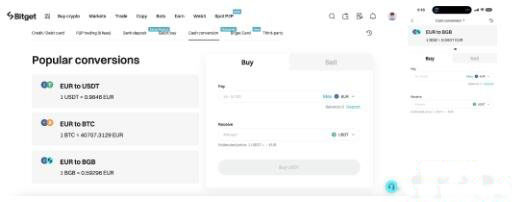 前往现金闪兑页面,选择您喜欢的法定货币和加密货币、输入所需的金额,然后选择最适合您的选项。或者,您也可以透过Bitget App 上的「充值/买币」,找到现金闪兑功能。